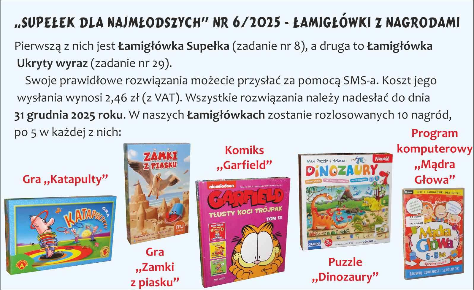 w najnowszym numerze „Supełka dla najmłodszych” (nr 6/2025) wkradł się błąd drukarski, przez który zabrakło informacji o nagrodach, jakie możecie wygrać w tym numerze oraz terminu nadsyłania rozwiązań. Poniżej załączamy prawidłową informację. Serdecznie przepraszamy za zaistniałą sytuację.
